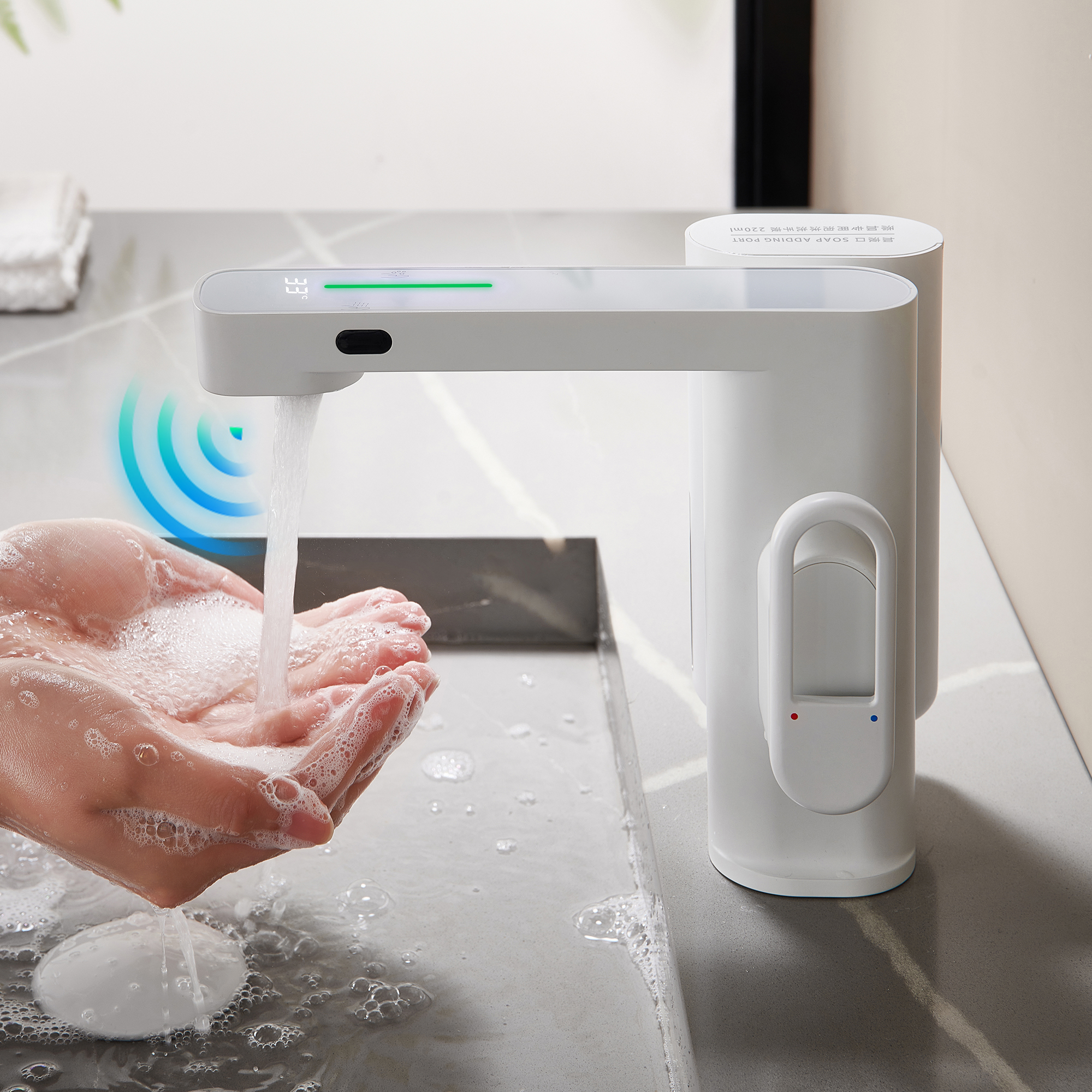 2 in 1 Led Digital Touchless Bathroom Tap Automatic Infrared Sensor Brass Mixer Smart Basin Faucet with Liquid Soap Dispenser