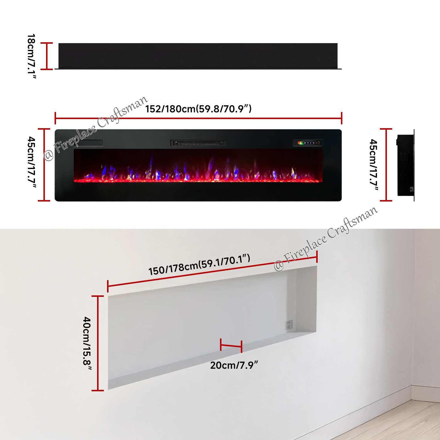 59 70'' Indoor Decoration Electric Fireplace Heaters Insert Remote Control Adjustable Flame Brightness Wall Mounted Fire Place